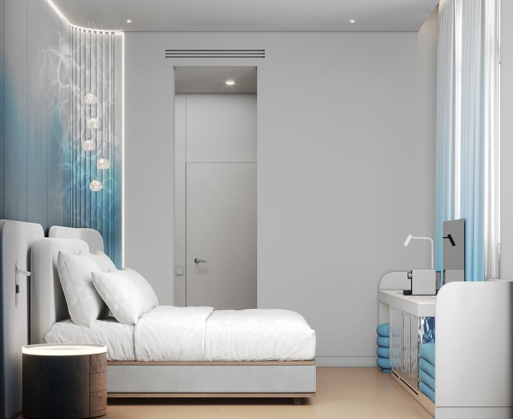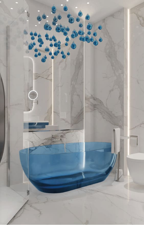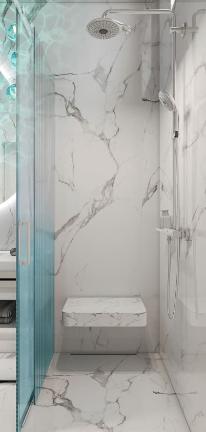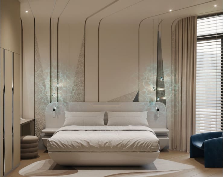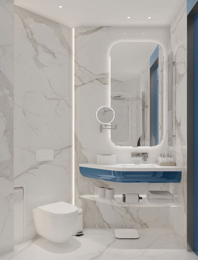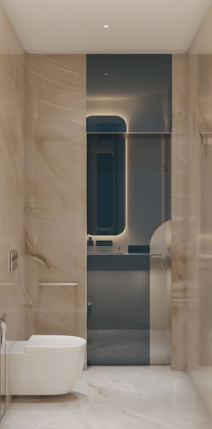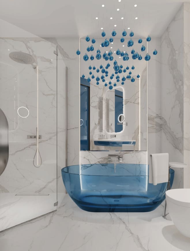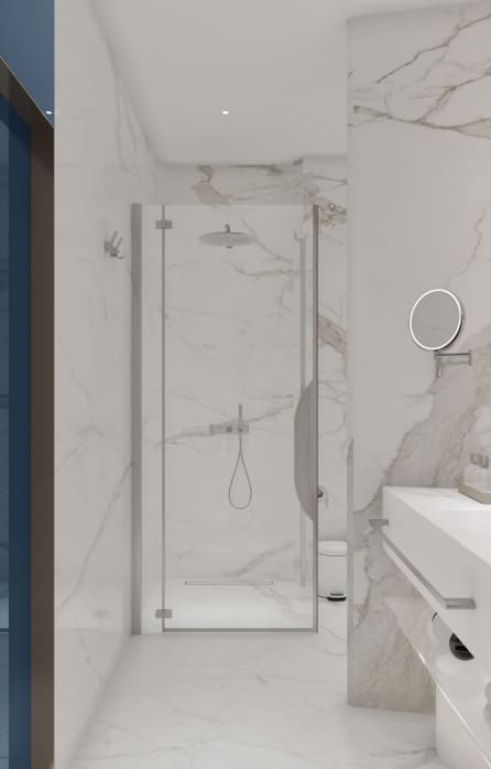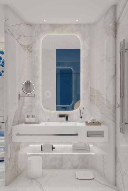 Перед нами стояла сложная задача: уложиться в два месяца, согласовать множество отделок и минимизировать риски при работе с большим количеством поставщиков. Вместо изначального подхода с 12 фабриками мы предложили концентрацию на трёх ключевых производствах — один итальянский партнёр взял на себя свет и кастомные ванны с идентичной отделкой, другой — мебель была реализована на надёжном португальском производстве. Благодаря личному визиту на фабрику и глубокой проработке деталей, нам удалось точно завязать фактуры света, мебели и сантехники в единую систему. Такой подход не только упростил логистику и контроль сроков, но и позволил снизить общий бюджет на 25%.